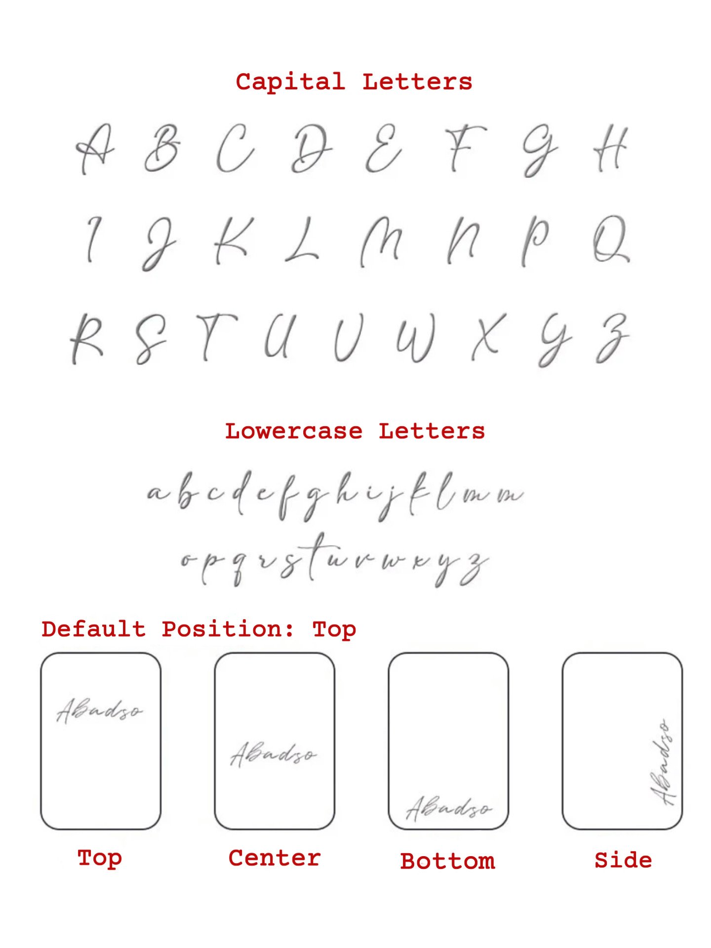 Font & Position: Shown in the product images.